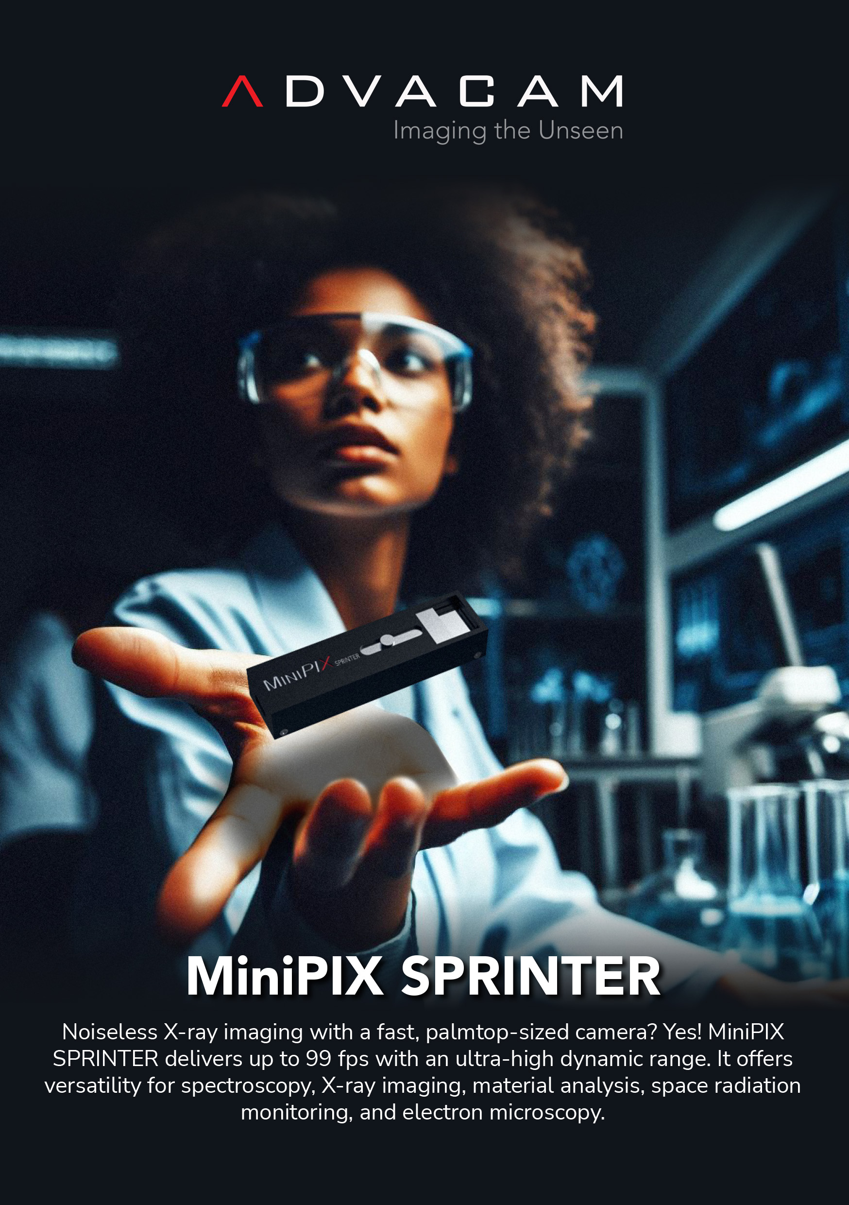 A compact radiation detection solution combining high-speed imaging at up to 99 fps with upgraded new-gen Timepix technology. It offers versatility for various detection applications, from material analysis to the space industry or electron microscopy.