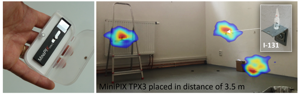 Compton camera for RaDron project will be based on Miniaturized detector MiniPIX TPX3 developed in ADVACAM company, which is shown on the left picture. Result of proof-of-concept experiment of the static monitoring is shown on right: three I-131 sources of activity 10 MBq were placed to distance 3.5 m from the camera.
